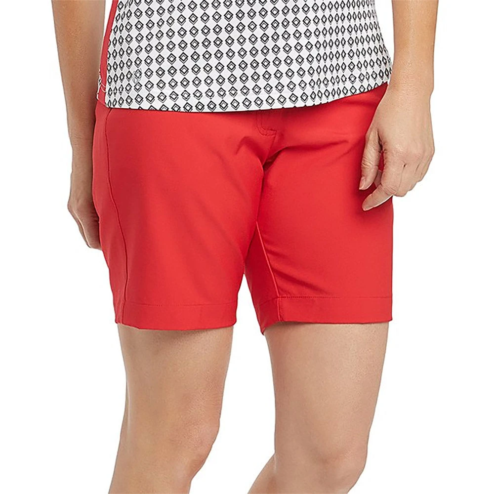 The GGBlue Bunker Womens Golf Short is made from stretch woven performance fabric, and features a fly front with snap closure, two front and two back pockets, belt loops, and UPF 50+ sun protection.